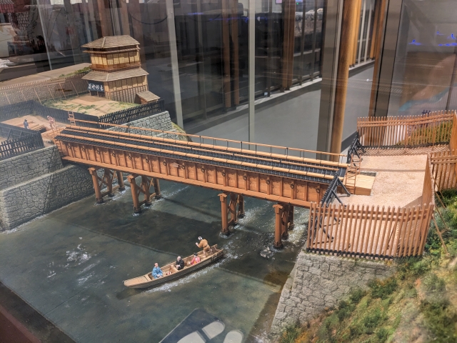 こちらは懸樋(かけひ)の模型。川や堀を通る際は、このような水道橋を用いて水を流していたそうです。ちなみに、水道橋駅は、このような掛樋があったことが駅名の由来であるそうです。