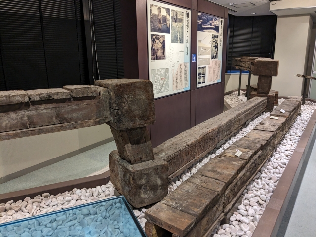 まずは2階の江戸時代の展示から。まるでベンチのように横たわる木型は、「角型木樋」。木樋(もくひ)というのは文字通り木でできた樋(とい)のことであり、江戸時代の水道管の役割を担っていたもの。