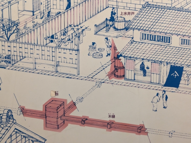 神田上水、玉川上水など整備された上水道から、地下に埋められた木樋を通って各上水井戸へと配水されていました。