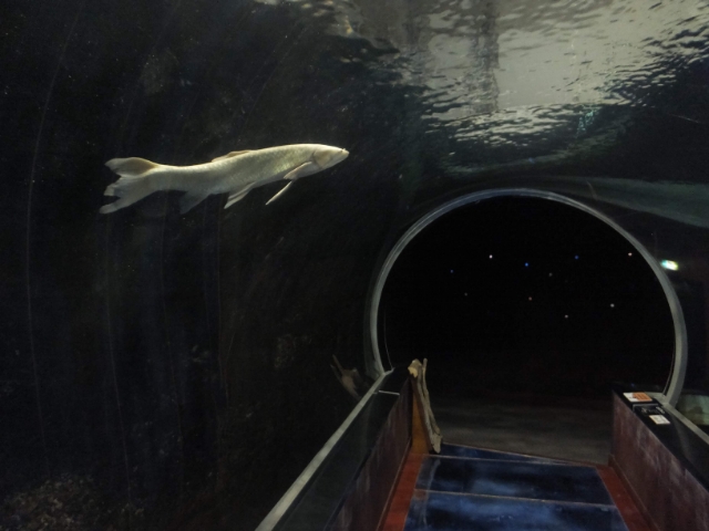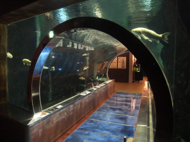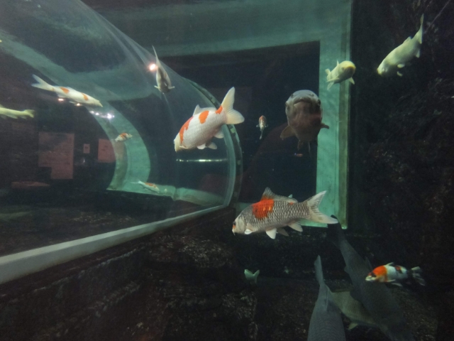 泳いでいるのは、アオウオやコイなど大型の淡水魚たち。一見すると地味ですが、すっかりトンネル水槽=海水魚のイメージがついてしまっているので逆に新鮮。