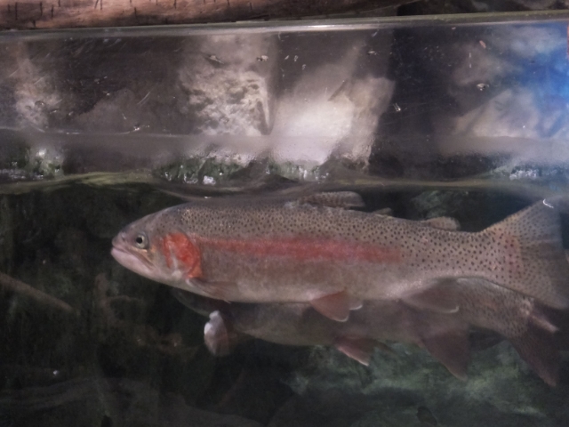 泳いでいるのは色あざやかなニジマス。馴染み深いサカナですが、1877年頃日本に移入された外来種です。