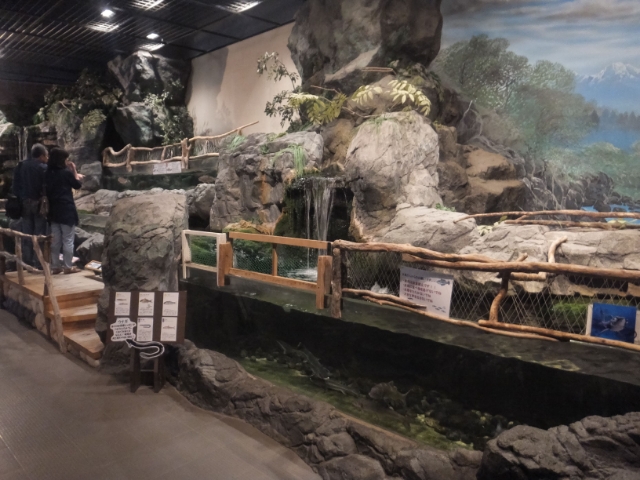 館内では、すぐ近くを流れる利根川に暮らす生き物をはじめとした淡水生物が飼育・展示されています。流木や岩で作られた立体的な水槽は渓流の雰囲気満点。