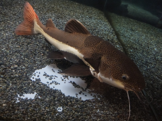 この水族館の中でボスの風格が出ているのは大きなレッドテールキャット。とても人なつっこい性格なんだって!