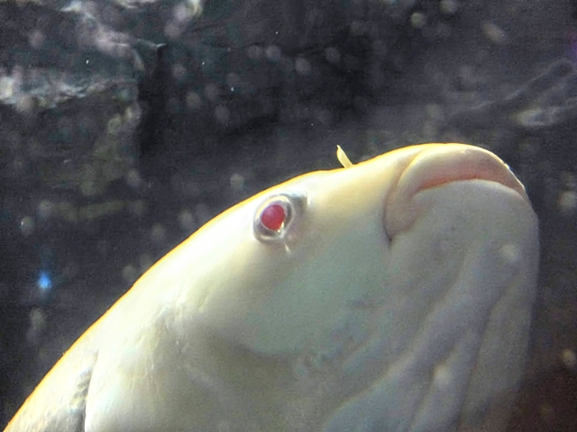 これはアルビノのソウギョ。アルビノというのは、生まれながらにメラニンが欠乏している白い個体のこと。動物園などでも馴染み深いシロウサギや、ウーパールーパーもこのアルビノです。