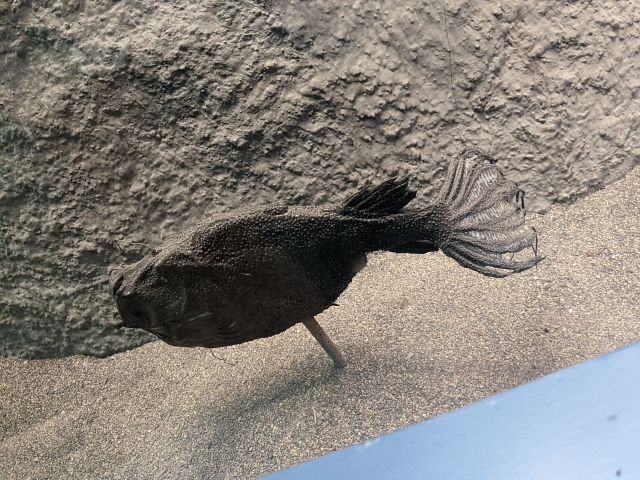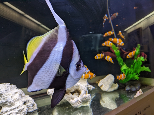 通常海水の塩分濃度は3.5%程度ですが、この水槽の塩分濃度は0.8%。この濃度であれば、淡水魚も海水魚も暮らせるそう。宮古水産高校にて発見されたとのことです。
