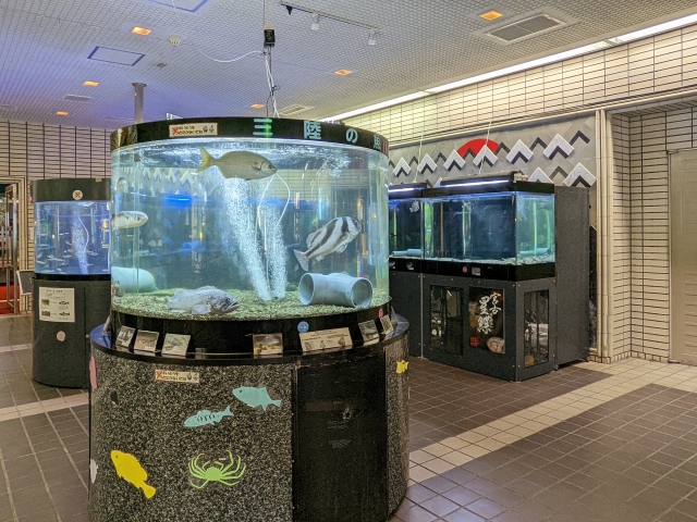 エントランスホールでは15基の水槽のお出迎え。まるで水族館のような光景に気分が高まります。