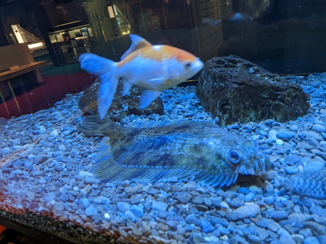 金魚の水槽もあります!一見すると普通の金魚水槽なのですが、よく見ると底の部分に海水魚であるはずのマハゼとヌマガレイが!