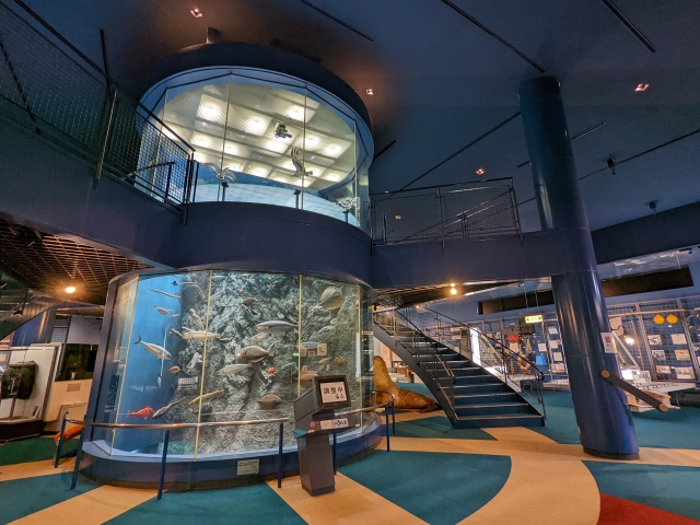 エントランスホールを抜けて展示室に入ると、巨大な円筒水槽……のような展示コーナー。まるで大水槽のような存在感ですが、水は入っておらずサカナの剥製が吊るされています。