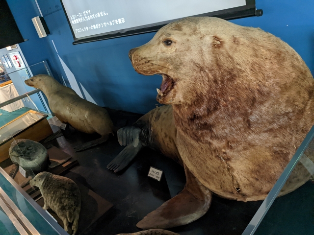 巨大なトドをはじめ、ゴマフアザラシやオットセイなど海洋哺乳類の剥製もあります。中には、おさわり自由なトドの剥製もありました。