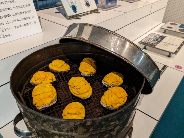 こちらは焼ウニ。宮古市の重茂地区では、新鮮なウニをアワビの貝殻に乗せて焼いて食べるそう。