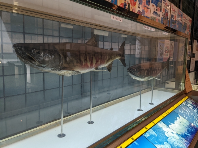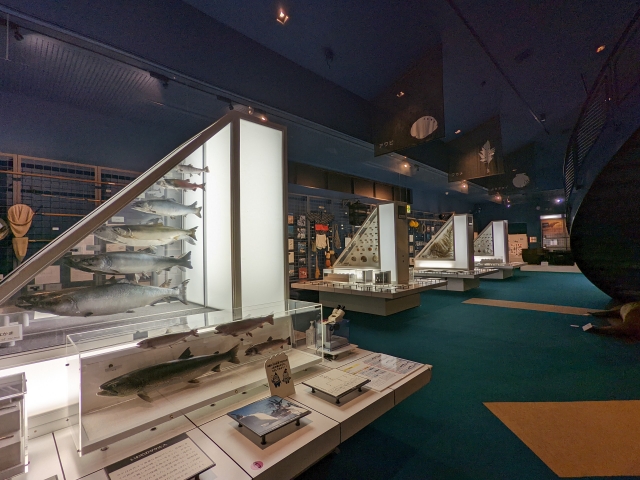サケ、アワビ、ワカメ、ホタテガイといった名産はそれぞれコーナーが設けられており、その生態や利用についてたっぷりと解説されてます。
