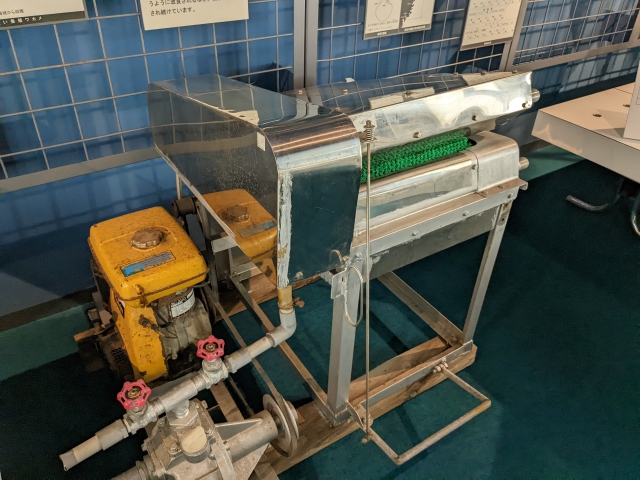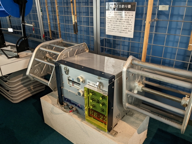 こちらのマシンは自動イカ釣り機。イカ針を自動で巻き上げる機械とのことで、本体には「水深」「タルミ」「シャクリ」など調節のノブが付いています。伝統的な漁具に比べて、こういう現代の漁具である機械が展示されているのはとってもレア!普段目にすることが無いため凄く新鮮です。