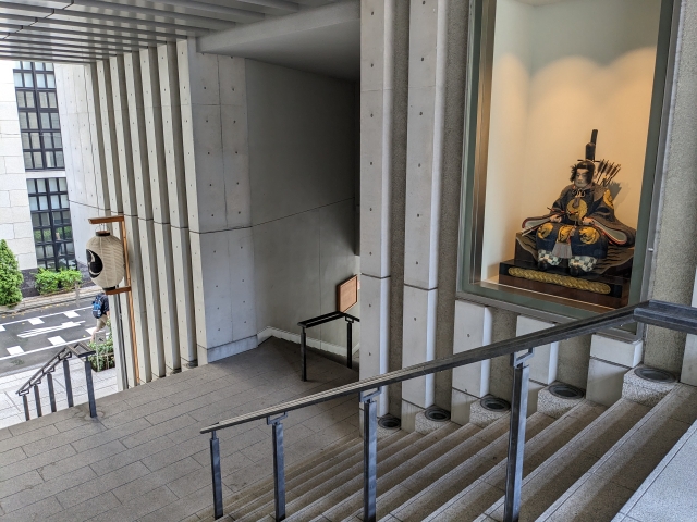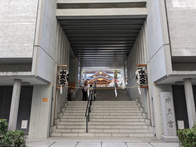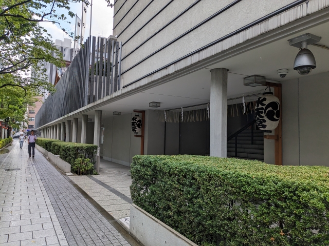 東京メトロ半蔵門線の水天宮前駅を出ると、すぐに見えてくるコンクリートの建造物。こちらは江戸時代に建立された神社、水天宮。神社のイメージとは少し離れた現代建築ですが、吊り下げられた提灯からわずかに神社の情緒を感じます。