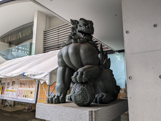 登った先にかまえる狛犬は、台座含めて3mほどと大きめサイズ。胸板が厚くマッチョな感じです。この像は、ブリヂストンの創立者である石橋正二郎氏が奉納したものであるそう。