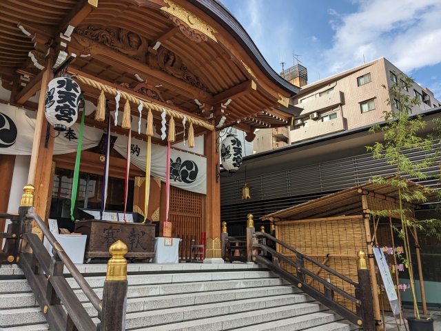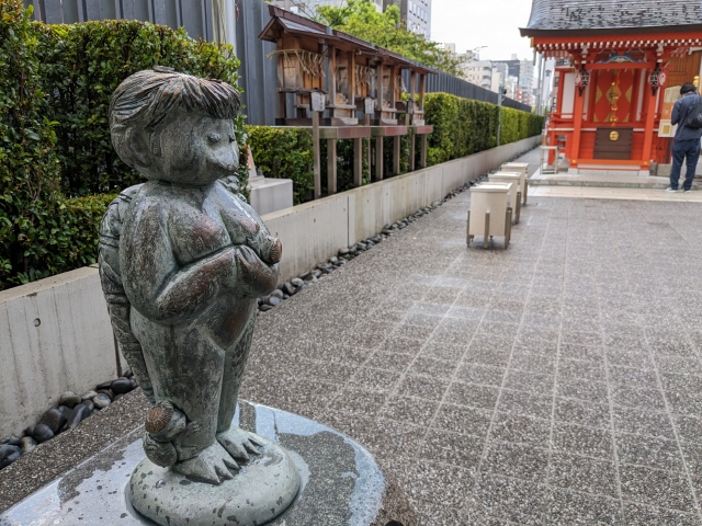 都会の真ん中に建つ都市型神社。外観は現代的な佇まいですが、境内へと足を進めると神社らしい趣のある空間が広がります。安産祈願の神社として信仰されており、境内には子育て中のカッパと犬の姿を見ることができます。