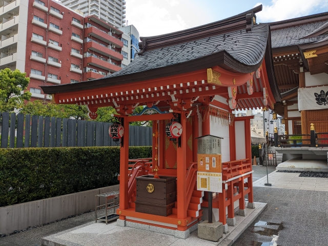 本殿向かって左手に立つ真っ赤な社。こちらは宝生弁財天という境内社で、芸事、学業、さらには金運のご利益があるといわれています。この弁財天は、小網神社や椙森神社などと合わせて、日本橋七福神に数えられています。