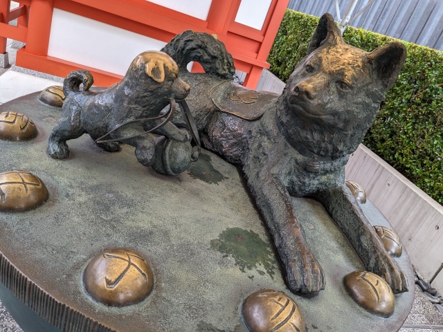 もう一つが「子宝いぬ」。鈴で遊ぶ子犬と、それを暖かく見守る親犬が並ぶ微笑ましい像。まわりには十二支の珠が埋め込まれており、自分の干支をさわるとご利益があるそうです。