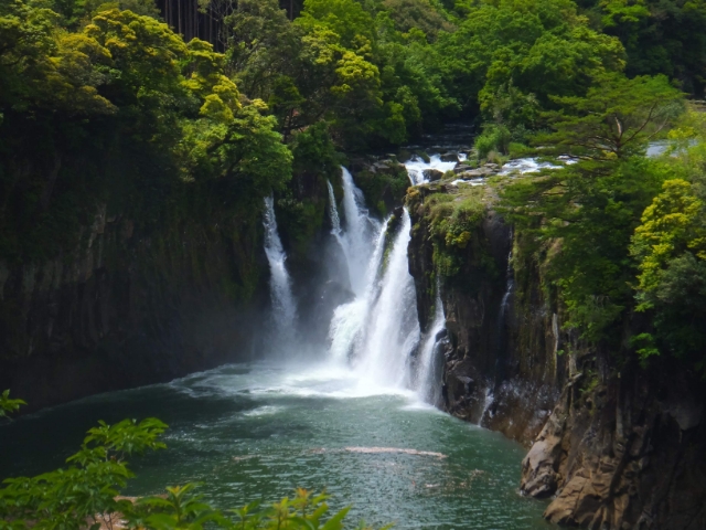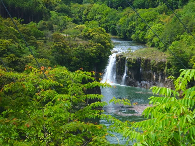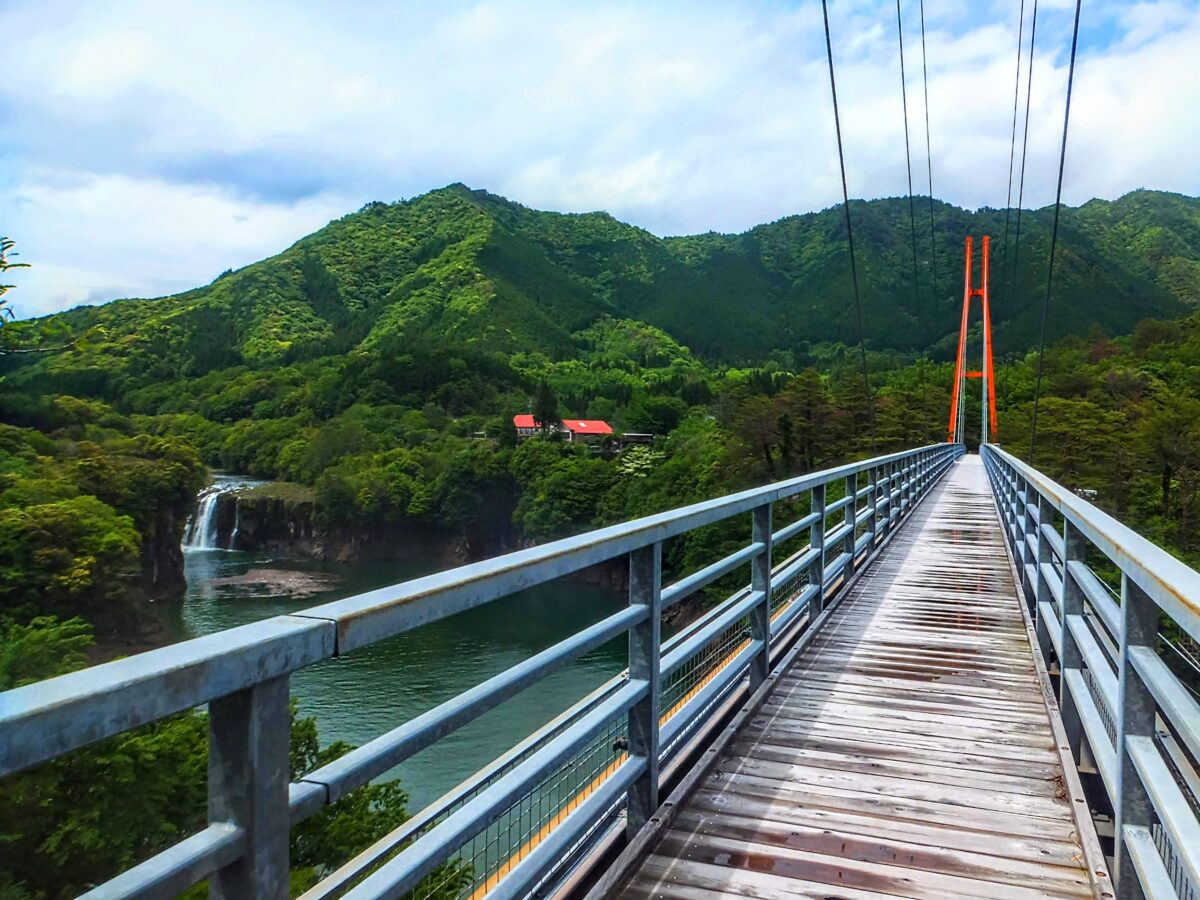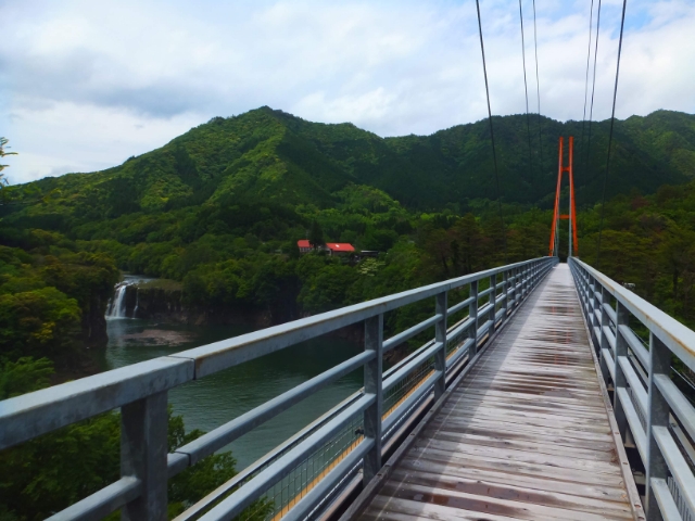橋の真ん中からは、先ほど見えた滝がより近くに。こちらの滝は須木の滝。落差41メートルの立派な滝です。