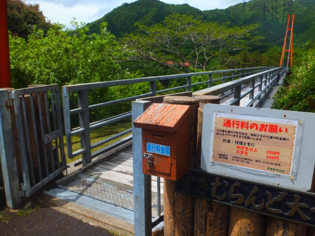 さあ、気を取り直して吊り橋を渡ります!通行料は片道・往復ともに200円。料金箱に入れるタイプなので、小銭の用意をお忘れなく。