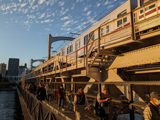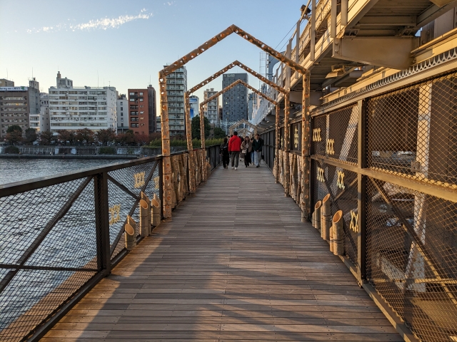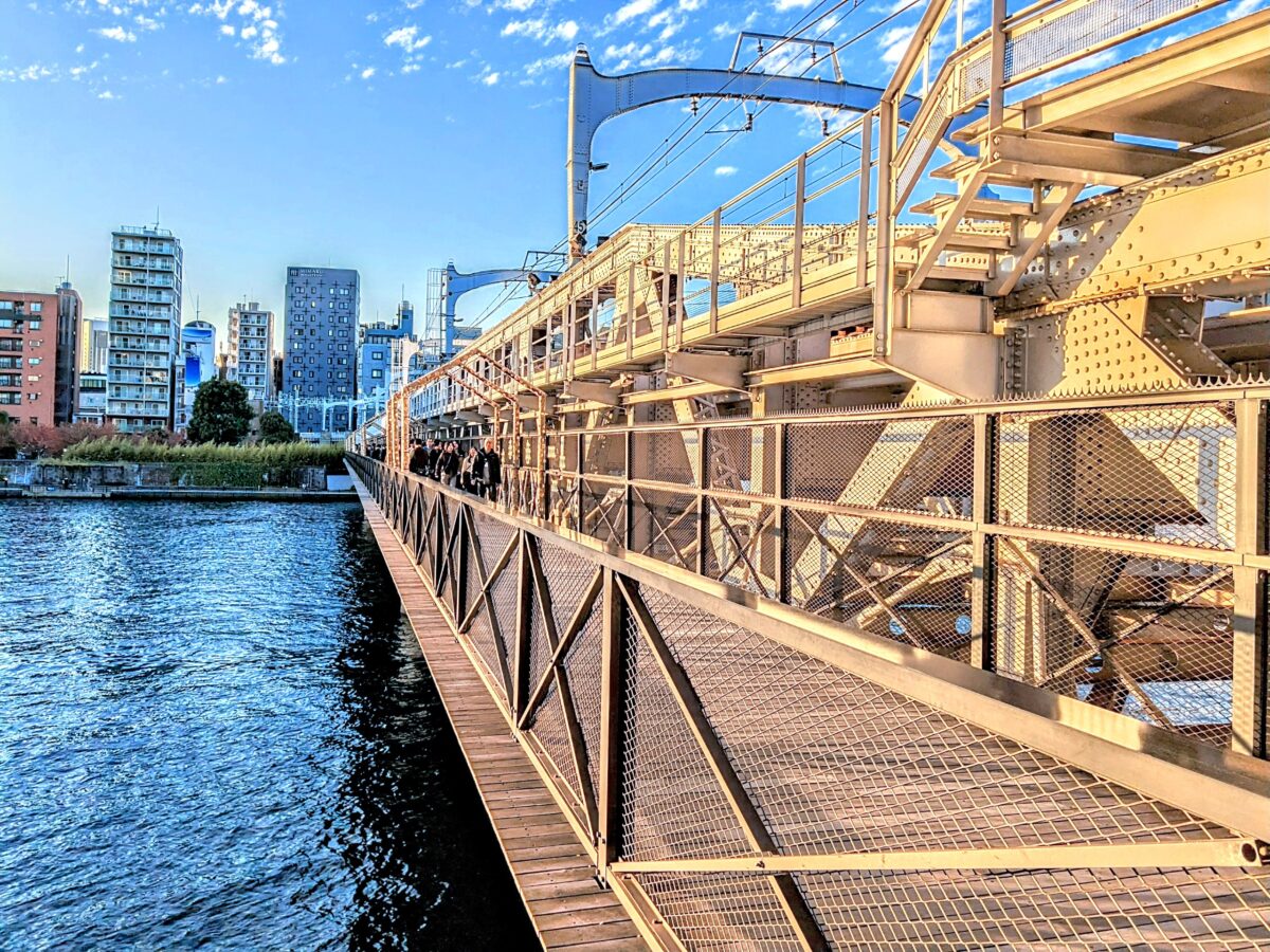 鉄道橋に沿って伸びる歩行者線用の道。ゆったりと流れる隅田川の上を、気軽に水上散歩が楽しめます。2つの観光地をつなぐルートであるため、途切れることなく人が歩いているにぎやかな橋です。