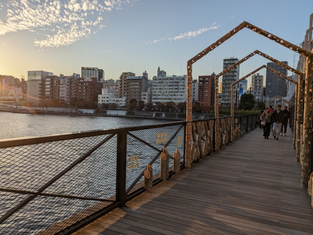 西側は今も昔も東京観光の一大人気エリア「浅草」であり、東側は少し歩くと「東京スカイツリー」へと繋がります。この橋ができたことにより、東京を代表する2大観光地を気軽に徒歩で移動できるようになったのです。