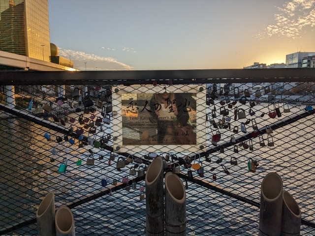 中央付近のフェンスには、なにやら大量の南京錠が。中央に貼られた金色のプレートに記されていたのは「恋人の聖地」。早くも聖地にリストインしているのですね。