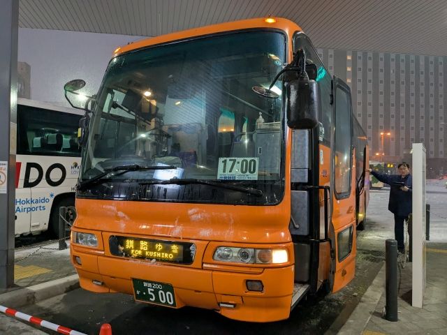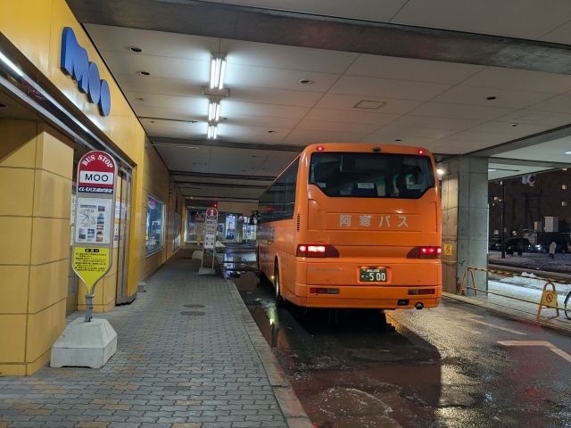 今回利用したのは17:00発の便。北見駅には16:30には到着、出発まで待機しています。阿寒バスはオレンジのボディでとってもわかりやすいです。