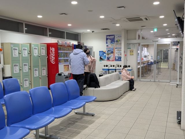 ターミナルには屋内の待合所も。コンビニこそありませんが、自動販売機や駅構内の売店にて飲み物やパンなどは購入可能。