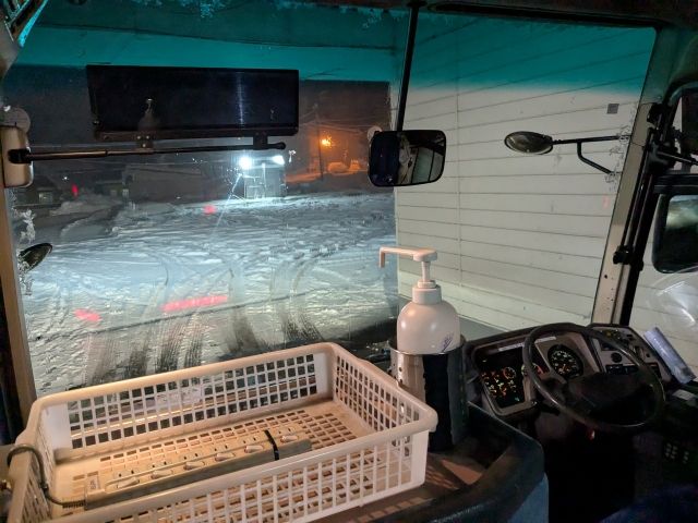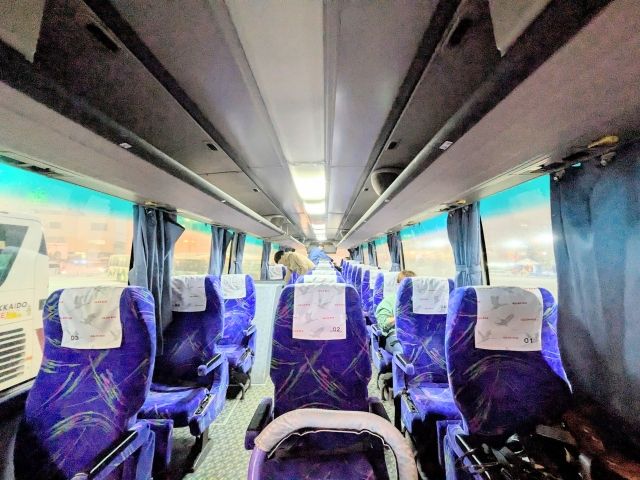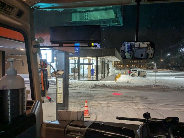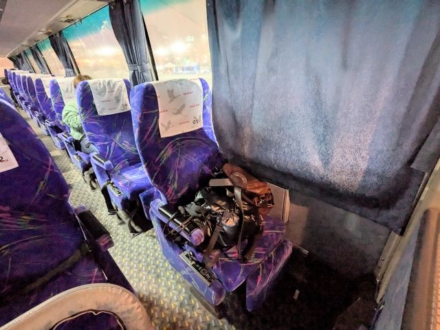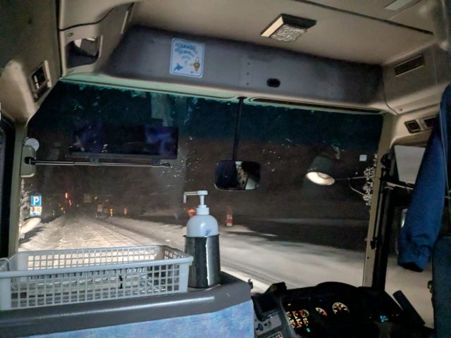 こんな真冬のバスはさぞ寒かろうと思いきや、暖房がしっかり効いておりぽかぽか。ちょっと暑いくらいだったので、上着を脱いだり、カーテンを少し開けて隙間の冷気で調節してみたりして過ごしました。