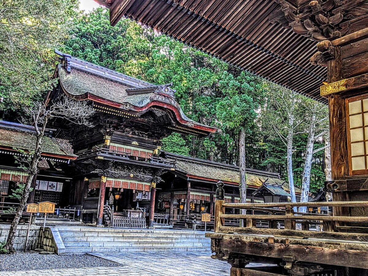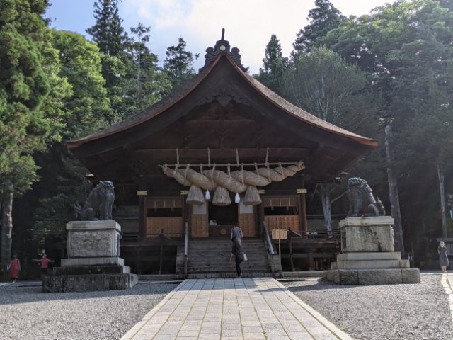 2階部分が大きく造られているため、一見すると少しアンバランス。しかし、それを支えるかのように両サイドには左右片拝殿が広がっているため、均整のとれた安定感が加わっています。