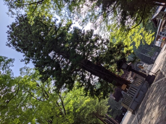 参道を進むと、正面に見える巨大な樹。こちらは根入りの杉(寝入りの杉)。樹齢700年ほどといわれる古木です。丑三つ時になると、枝を下げて眠りにつき、木の幹に耳を当てると寝息が聞こえるそう。小枝を煎じて子供に飲ませると夜泣きが止まり、葉を枕に入れると安眠できるといわれています。