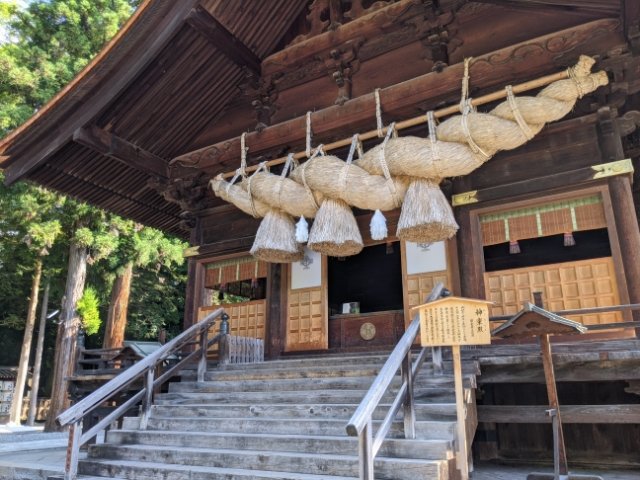 境内を進むと見えてくる神楽殿。神楽を奉納するための建物で、天保6年(1835年)に建てられました。彫刻などの装飾はほとんどありませんが、重厚な姿は非常に存在感があります。