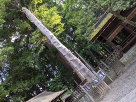 境内にそびえる巨大な木の柱。こちらは「御柱(おんばしら)」という、寅年と申年の7年に一度行われる御柱祭において建てられる巨木。大きなもので長さ17m・重さ10tを超え、山中から人力のみで運ばれ建て替えられます。 その激しい様子はテレビ中継などで見たことがあるという人も多いのではないでしょうか。