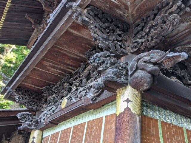 目を引くのは、精巧な彫刻。流れるような波や龍など、躍動感のある造形は、今にも動き出しそう。写真には写っていませんが、拝殿内部の「竹に鶴」は、繊細で見応えあります。