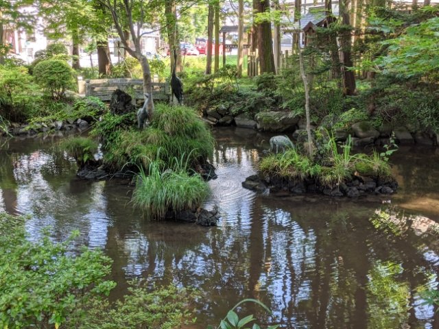 参道から少し離れたところにある緑豊かな池。中央の小島には3羽の鶴の銅像が建てられており、たちたちと水が吹き出しています。こちらは千尋池といい、諏訪大社下社の宝印である「売神祝ノ印(めがみほうりのいん)」が発見された場所です。