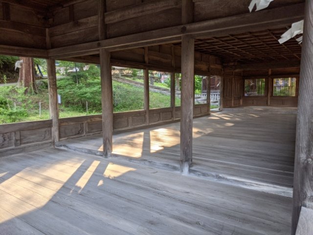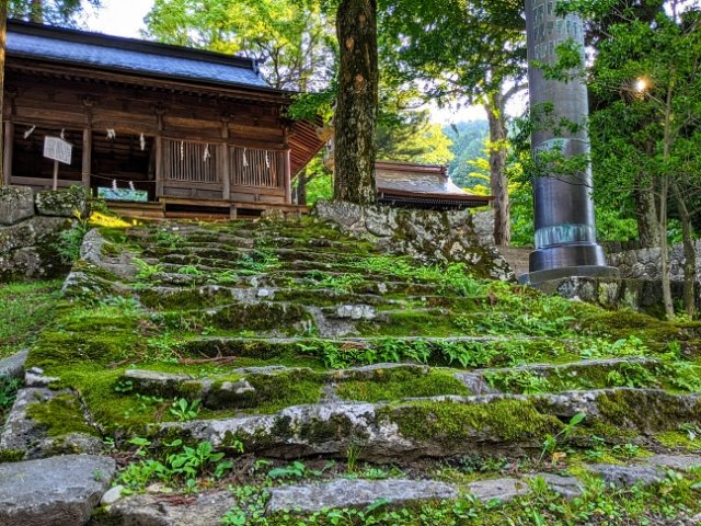 苔むした石段の先にあるのは十間廊。祭り事が行われた場所で、神に捧げる貢物は、全てここで供えられています。