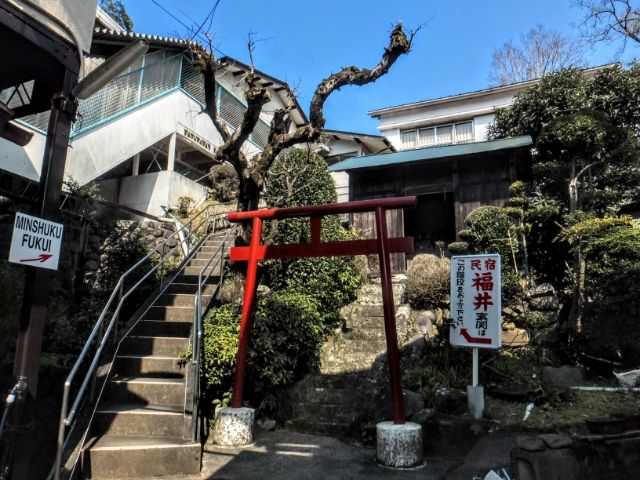 建物は少しだけ高い位置にあり、鳥居の脇の階段を登ったところが民宿の入口。