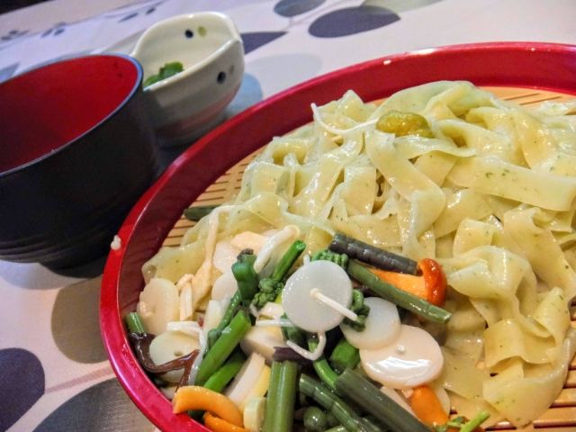 頼んだのはわさび麺。ワサビがたっぷり練り込んである平麺です。めんつゆにつけてたべるので、平たいうどんのようなイメージ。コシがあってとっても美味しい!
