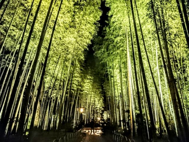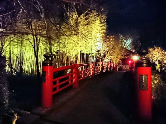 楓橋の先にあるのは煌めく竹林の小径!すらっと立ち並ぶ竹がライトアップされた姿は、なんとも幻想的です。