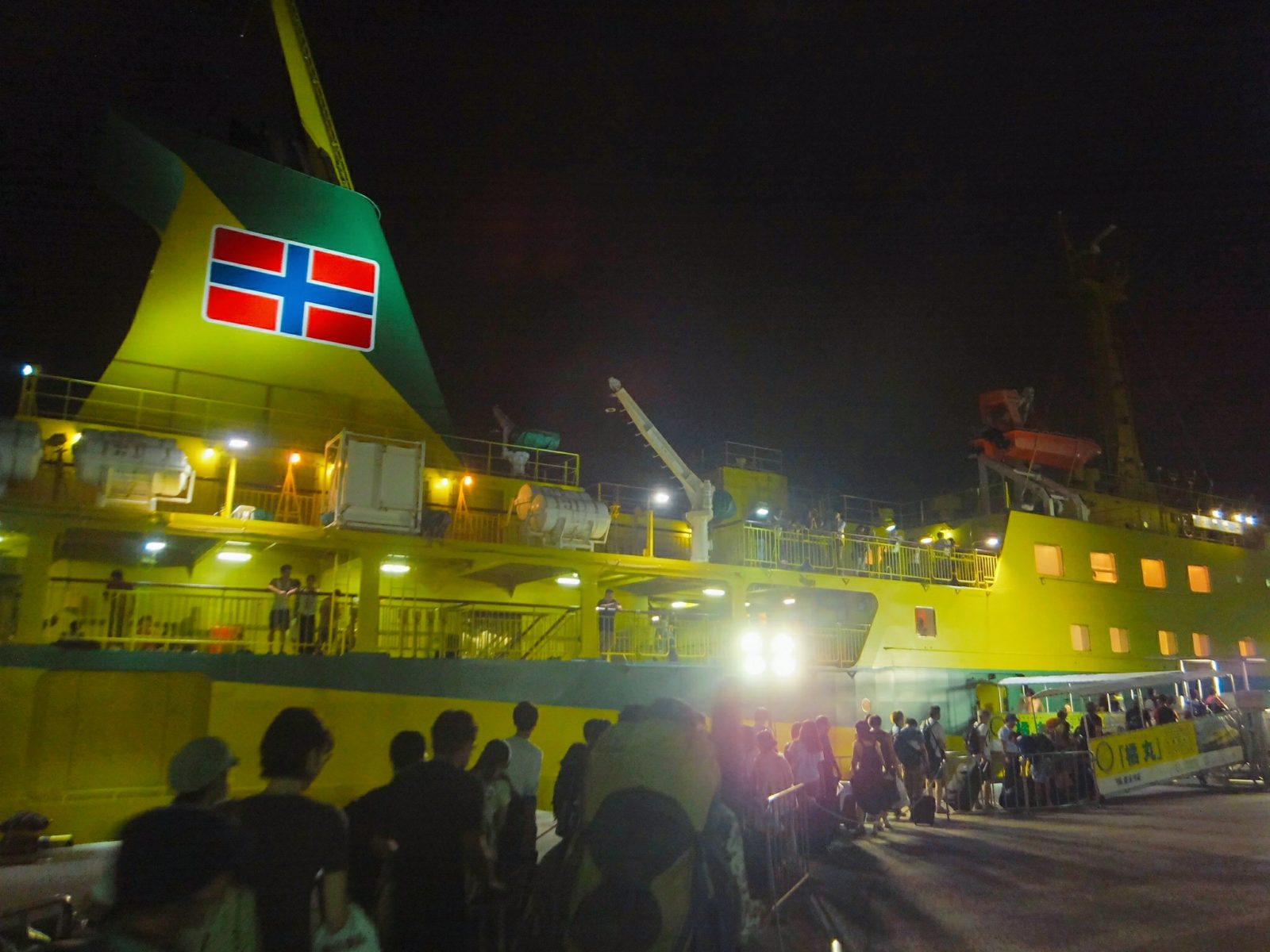 チケットが無事購入できたので、そのまま列に並んで乗船。2014年に竣工した大型船「橘丸」は、黄色いボディが目印です。橘丸という船は過去にも就航していたので、この船は正確には三代目橘丸。
