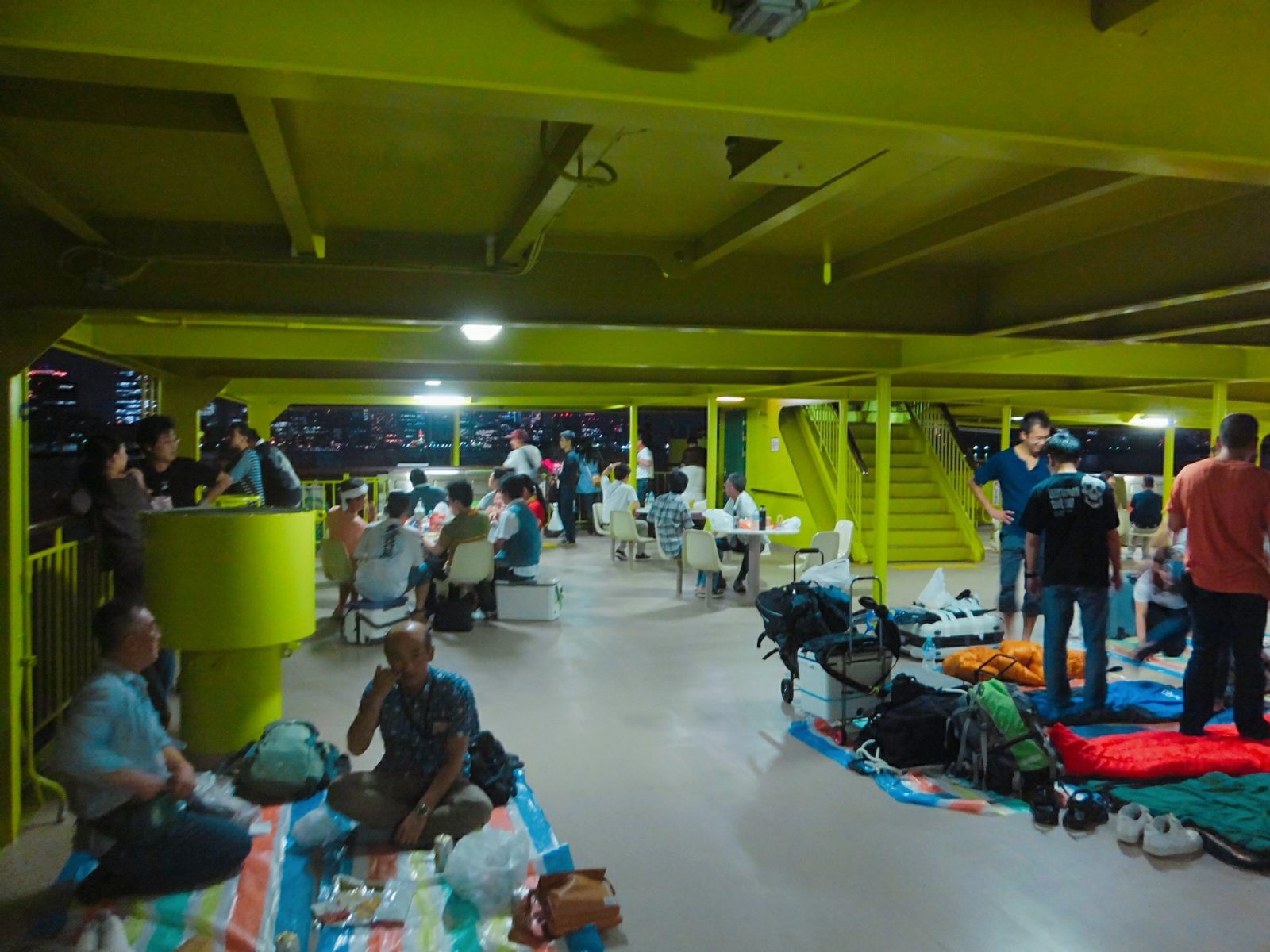 船内では、席を確保できなかった人々がそこかしこでレジャーシート広げています。