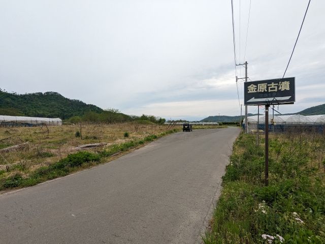 最初に向かったのは金原古墳。Google Mapのポイントに向かうと、案内板があり、路肩に車を停めるスペースもありました。