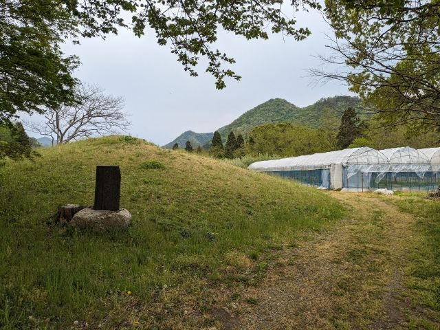 矢印通りに畑の中の道を進んでいくと、プレートとともに、こんもりとした墳丘の姿が。7世紀中頃に築造されたと考えられている古墳で、現存している墳丘の直径は24m。これは高畠町の古墳の中でも最大規模とのこと。畑に包まれているので畑古墳とジャンル分けしてみましょう。