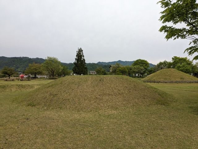 「うきたむ風土記の丘考古資料館」のすぐ目の前にも古墳があります。まほろば古の里歴史公園という広場に鎮座するのは、安久津支群。7基あったうち2基が復元されています。
