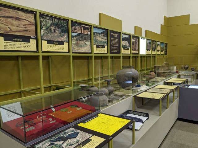 安久津支群のそばに建つうきたむ風土記の丘考古資料館。日向洞窟、大立洞窟、火箱岩洞窟など、多数の洞窟遺跡の紹介や出土品の展示、再現された縄文時代の竪穴式住居などを見ることができます。