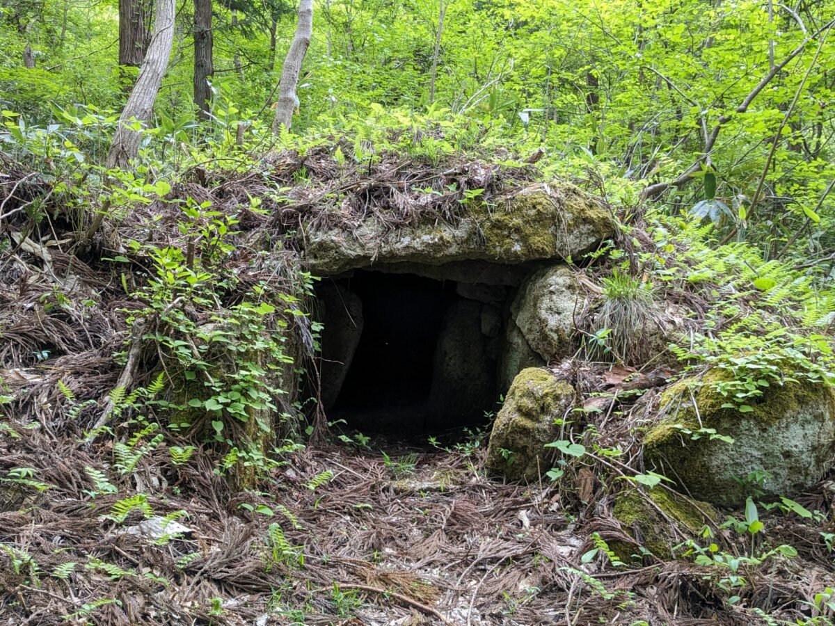 羨道と玄室からなる石室も見ることができます。凝灰岩の切石でできていることなので、おそらく高畠町名産の「髙畠石」でできているのでしょう。なお、石室の天井となる蓋石は失われており、オープンな状態です。
