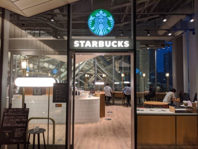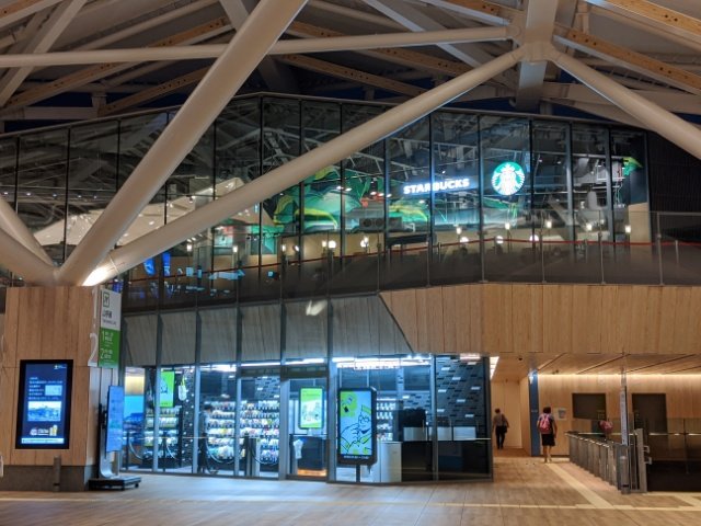 駅舎の3階、TTGの上にはスターバックスコーヒー高輪ゲートウェイ駅店が入店しています。改札内に見えますが、利用するには改札の外へ出る必要があります。