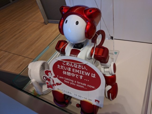 こちらの赤いマシンはHITACHIの対話型ロボット「EMIEW」。起動時間は10:00〜16:00と決まっているようです。