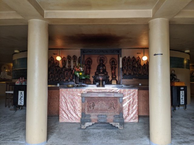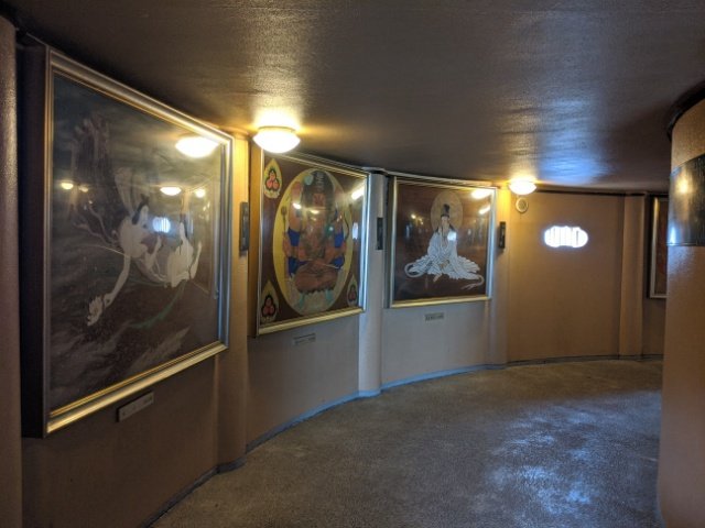 そこから回廊が延びており、台座内をぐるっと一周できます。回廊の壁面には、「愛染明王」や「白衣観音」などを描いた絵画が全部で13枚並びます。これらの仏画は、かつて高岡駅前にあった樹齢数百年の神木「七本杉」から作られた板に描かれています。