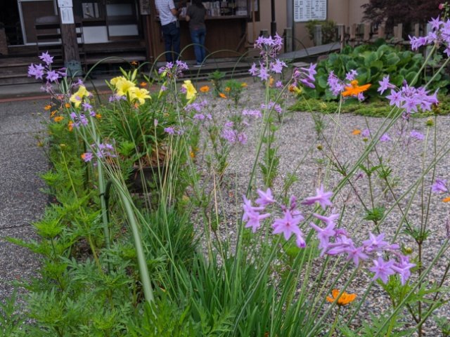 植物が手入れされており、キバナコスモスやツルバキアなどのお花がキレイに咲いています。花に誘われてタテハチョウも舞っていました。